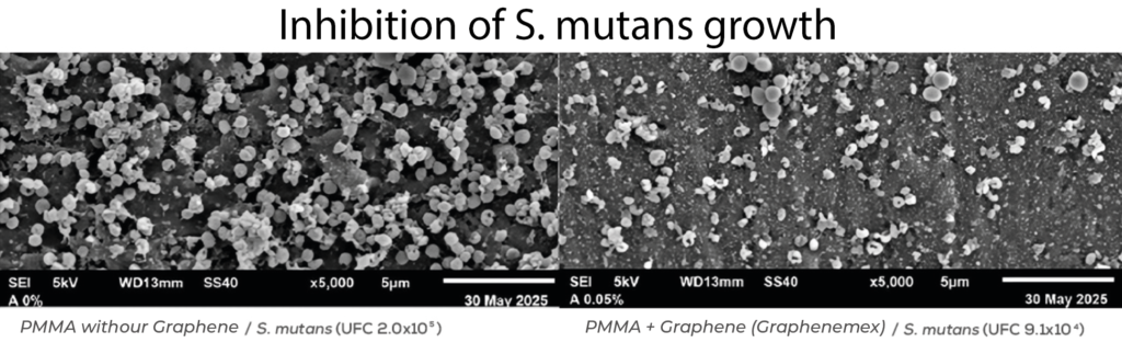 Overall, the experimental evidence positions PMMA modified with Graphenemex® graphene as a multifunctional dental biomaterial, offering mechanical, biological, and preventive advantages against oral biofilm-related pathologies. This advancement not only contributes to the evolution of modern dentistry but also reinforces Mexico’s role in the development of high-value, cutting-edge materials.